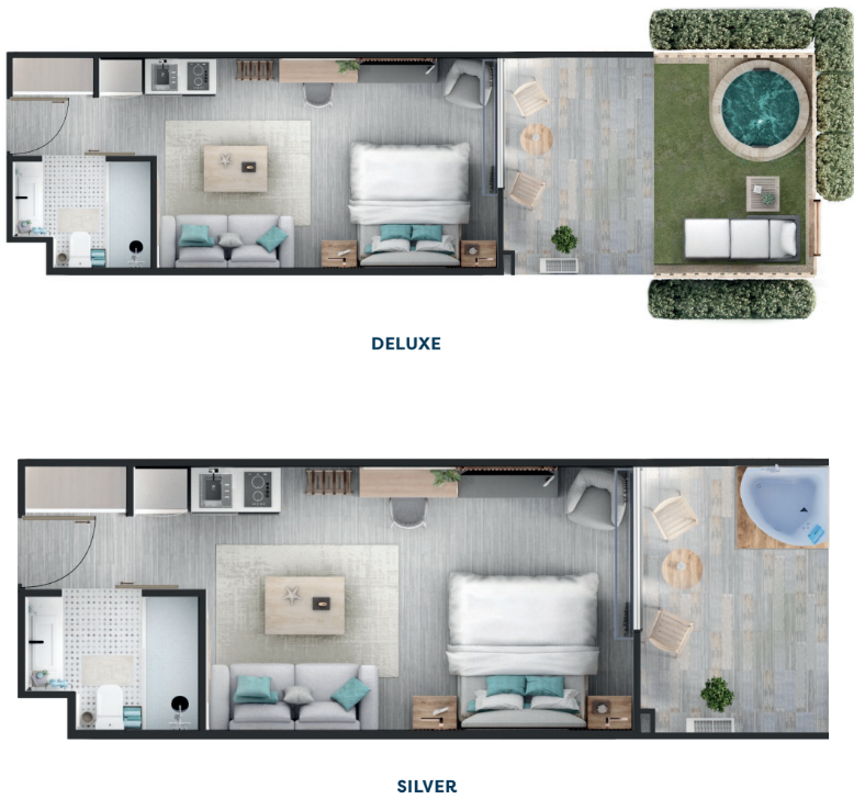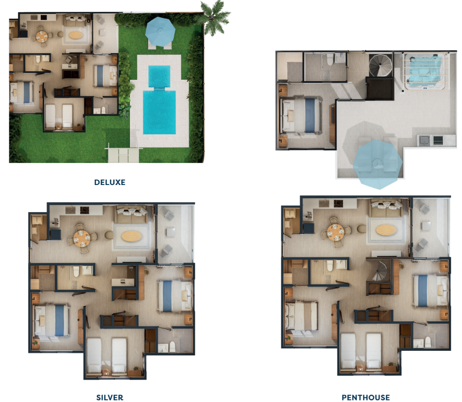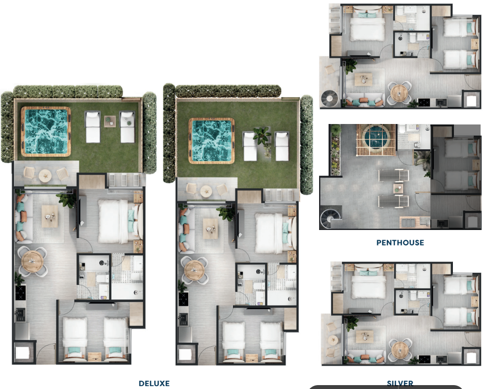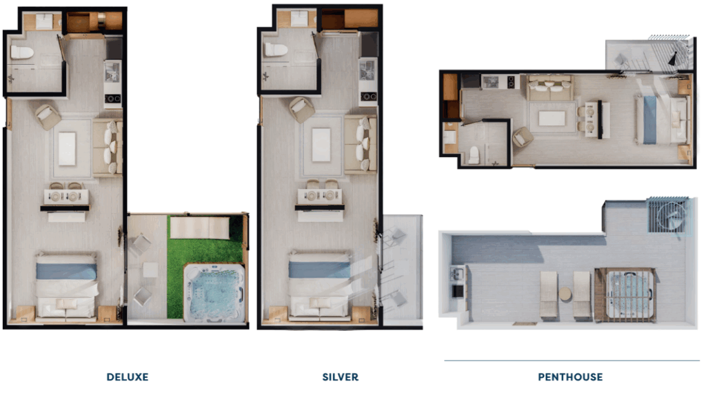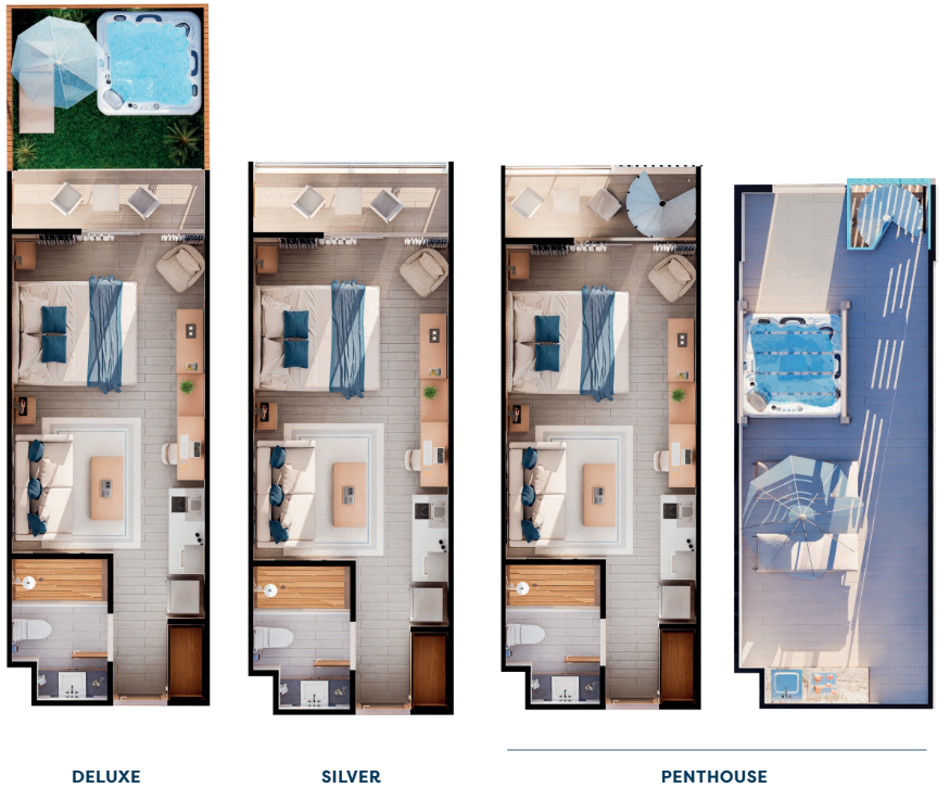 8 tipos de suites hoteleras, incluyendo 2 tipos de penthouse.